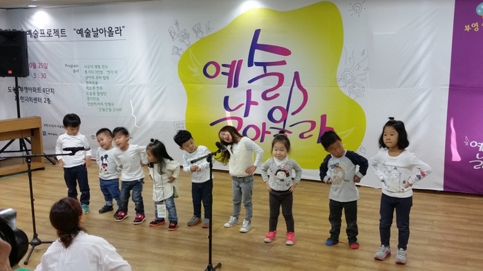 최근 경기 남양주시 도농동 부영아파트에서는 지역주민들과 함께하는 마을공연 행사 '예술날아올라' 가 진행됐다. 사진은 이날 행사에 참가한 날아리꼬마합창단이 율동을 선보이고 있는 모습. (사진제공=남양주시청)