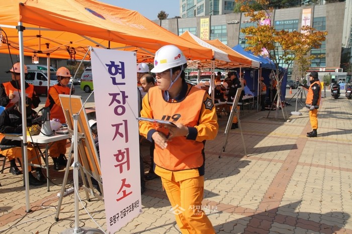 서울 은평소방서는 지난 29일 은평구 증산동 소재 두빌 오피스텔에서 은평구청 등 15개 긴급구조 지원기관 90여명이 참여한 가운데 '2014 긴급구조 종합훈련'을 실시했다. (사진제공=은평소방서)