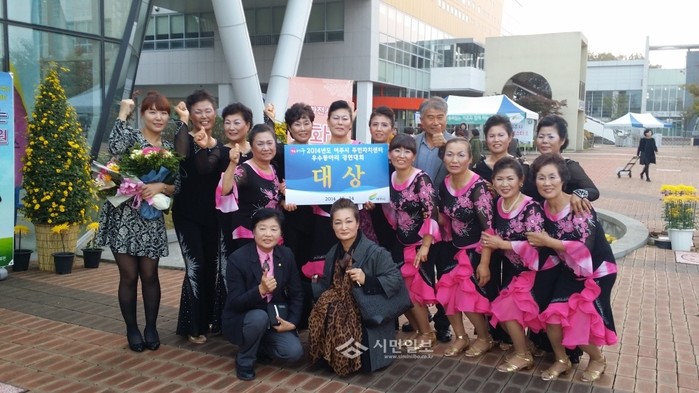 최근 경기 여주시 흥천면 주민자치위원회 댄스동아리가 '제2회 평생학습 공감축제'내 행사로 열린 ‘2014 여주시 주민자치위원회 우수동아리 경연대회’에서 대상을 수상했다. 사진은 이날 대상의 영예를 안은 흥천면 댄스동아리팀의 기념촬영 모습. (사진제공=여주시청)