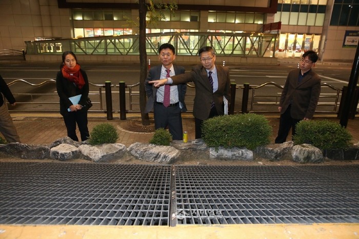 경기 안양시는 최근 지역내 위치한 지하환기구 789곳을 대상으로 긴급 안전점검을 실시했다. 사진은 심기보 부시장(오른쪽에서 세번째)이 직접 안전점검 현장을 찾아 관계자에게 안전조치 등을 보고받는 모습. (사진제공=안양시청)