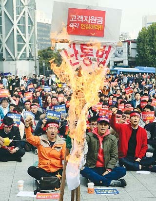 전국 휴대전화 대리점·판매점 모임인 전국이동통신유통협회(KMDA)가 30일 서울 종로구 보신각 앞에서 열린 단말기유통구조개선법(단통법) 중단 촉구 집회에서 화형식을 하고 있다. 이들은 고객 지원금 상한 요금을 실사용 금액에 맞출 것과 고객 위약금 철폐, 공시 지원금 상향, 공시 상한 기준 확대와 더불어 미래창조과학부 장관과 방송통신위원장의 공식 면담을 요청했다.
