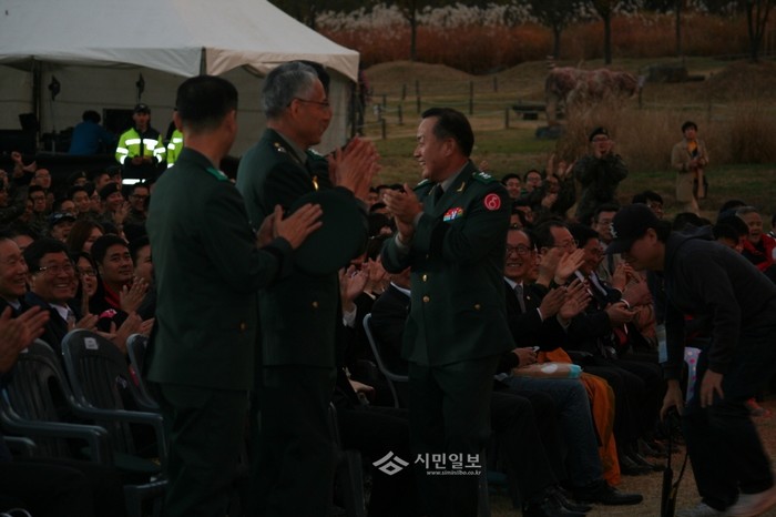 개막식에 참여한 연천 지역 인근 군 부대장들이 출연자의 요청으로 관람객에게 인사하고 있다.