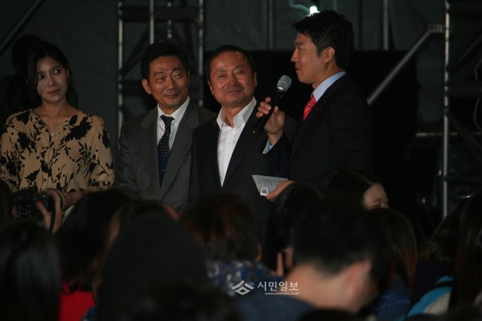 개막식 진행자인 신동진 아나운서와 뮤지컬 배우 배다해씨가 김규선 연천군수(오른쪽에서 두번째)에게 개막식에 대해 질의하고 있다.