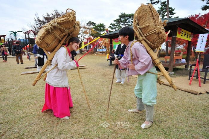 | ▲ 왕겨를 채운 가마니를 지게에 지고 오곡마당을 한바퀴 도는 '나도 지게꾼' 코너의 모습.(사진제공=여주시청) | ||