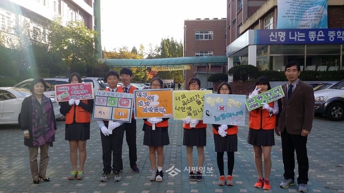 최근 서울 강동구 신명중학교는 바른언어 실천 주간을 맞아 전교생을 대상으로 '바른언어 실천 서약서 쓰고 좋은 말 쓰기 등교맞이 이벤트'를 실시했다. 사진은 이날 행사에 참가한 학생들이 홍보 손팻말을 들고 있는 모습. (사진제공=강동구청)