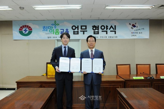 경기 구리시와 희망이음은 지난 30일 구리시청 상황실에서 소외계층 중·고등학교 학생 1360명에게 무료로 교육서비스를 제공하는 희망이음교육 협약을 체결했다. 사진은 박영순시장과 현재익 희망이음 대표가 협약식을 맺은 후 기념촬영 모습.(사진제공=구리시청)
