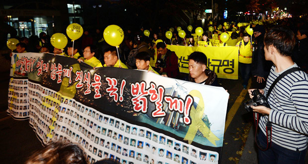 세월호 참사 발생 200일과 정치권의 세월호 특별법 최종 합의 이튿날인 1일 저녁 서울 광화문 청계광장에서 '세월호 참사 200일 범국민 추모대회'가 열린 가운데 참가자들이 진상 규명을 촉구하며 행진을 하고 있다.