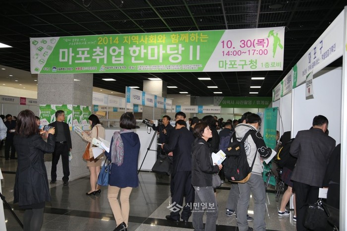 서울 마포구는 구청 1층 로비에서 중·장년층, 북한이탈주민, 청년층 등 구직자 500여명이 방문한 가운데 일자리 박람회인 '2014 지역사회와 함께하는 마포취업한마당Ⅱ'를 개최했다. 사진은 이날 구청 로비에서 열린 박람회를 찾은 구직자들의 모습. (사진제공=마포구청)
