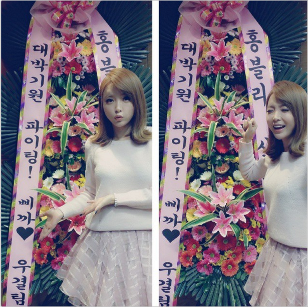 이날 홍진영은 "음악방송 첫방기념 우결 가족들이 보내주신 화환"이라는 글과 함께 화환과 나란히 선 자신의 모습이 담긴 사진을 공개했다.