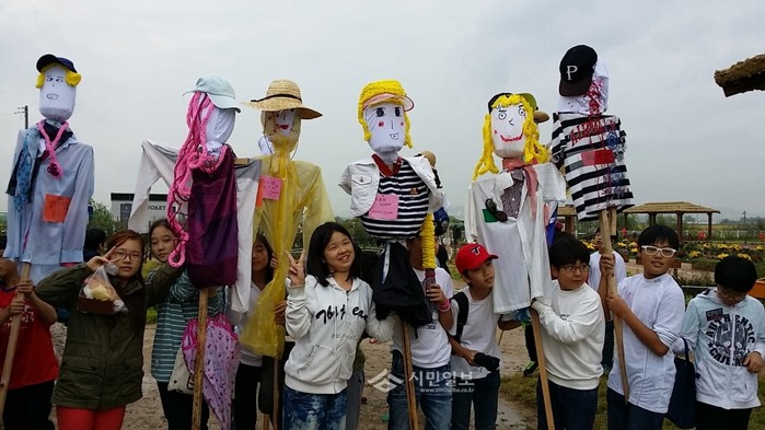 | ▲ 지난 10월 실시된 허수아비 만들기, 벼베기 등 프로그램으로 구성된 '농업체험 프로그램'에 참여한 어린이들의 모습. 이 허수아비들은 텃논 주변에 실제로 세워졌다.(사진제공=강서구청) | ||