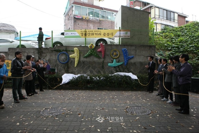 지난달 31일 서울 강동구 성안마을에서는 유명 웹툰작가 강풀이 공공미술로 재탄생시킨 ‘성안마을 강풀만화거리’ 준공식과 안말 어린이공원에서 개최하는 ‘제2회 성안마을 축제’를 개최했다. 사진은 성안마을에서 강 작가 외 관계자들이 참여해 강풀만화거리 준공식을 진행 중인 모습. (사진제공=강동구청)