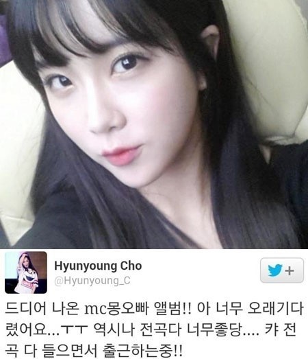 조현영은 3일 자신의 트위터에 드디어 나온 MC몽 오빠 앨범. 아 너무 오래 기다렸어요. 역시나 전곡 다 너무 좋다. 전곡 다 들으면서 출근하는 중”이라는 글을 사진과 함께 게재했다.