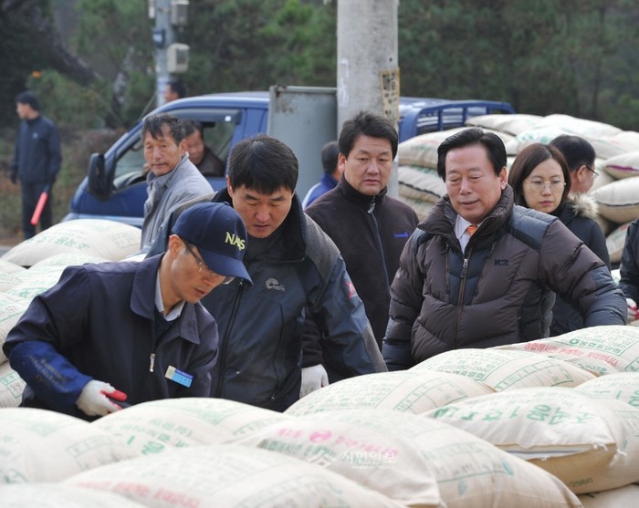 경기 광주시가 4일부터 '2014년도 공공비축미곡(건조벼) 매입'을 실시한 가운데 이날 첫 수매가 진행된 퇴촌면 도수리수매장을 방문한 조억동 시장(오른쪽에서 네번째)이 수매현장을 살펴보고 있다. (사진제공=광주시청)