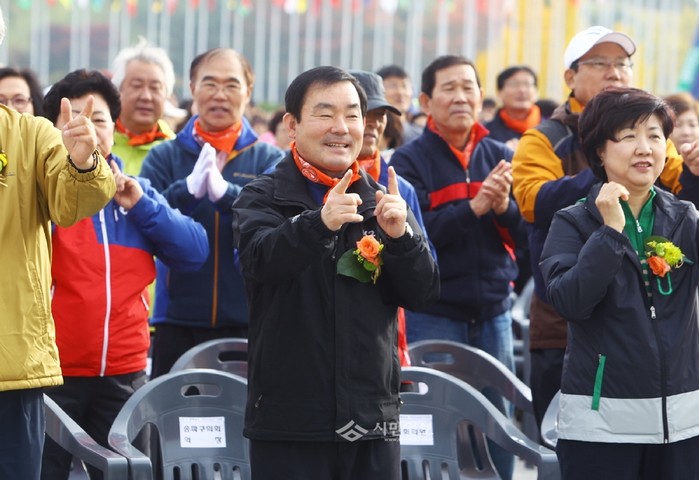서울 송파구의회 임춘대 의장이 지난 1일 올림픽공원 평화의 광장에서 개최된 '구민 건강 걷기대회'에 참석해 주민들과 함께 출발 전 시작하는 건강체조를 따라하고 있다. (사진제공=송파구의회)