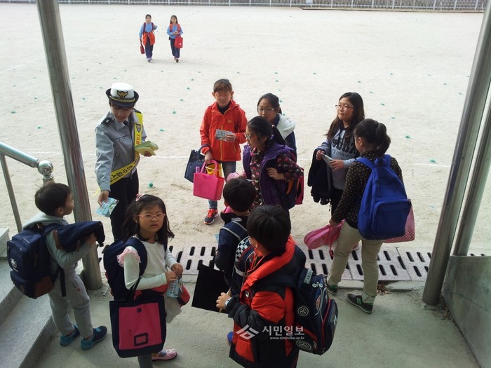 지난 3일 인천중부경찰서 교통안전계는 '릴레이 스쿨존 캠페인'의 일환으로 영종도에 위치한 공항초등학교를 찾아 하교하는 어린이들을 대상으로 안전한 등·하굣길을 위한 캠페인을 실시했다. 사진은 '무단횡단 금지’, ‘자전거 보도운행 금지' 등의 문구가 적힌 전단지를 나눠주는 경찰관의 모습. (사진제공=중부경찰서)