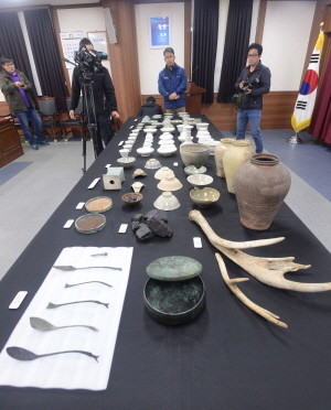 문화제청 국립해양문화재연구소는 지난 6월1일부터 시행 중인 충남 태안군 마도 해역에 대한 발굴조사에서 발굴된 유물들을 5일 오전 충남 태안 근홍면사무소에 전시하고 있다.