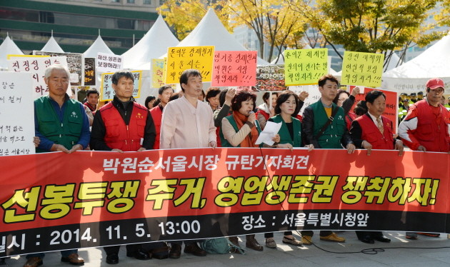5일 오후 서울시청 신청사 앞에서 전국철거민협의회 회원들이 서울시에 대한 투쟁 선포식 기자회견을 하고 있다. 전철협 회원들은 서울시장이 서울시 개발정책에 피해를 본 철거민들에게 직접 사과하고 대책을 마련할 것을 촉구했다.