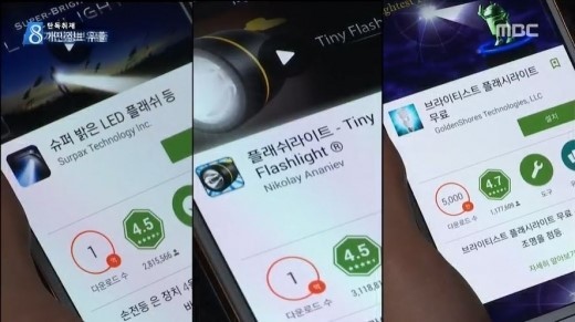 이날 MBC는 많은 사람들이 사용하고 있는 손전등앱을 분석한 결과 위치정보 등 개인정보들을 수집하는 명렁어가 숨겨져 있다고 단독 보도했다.
