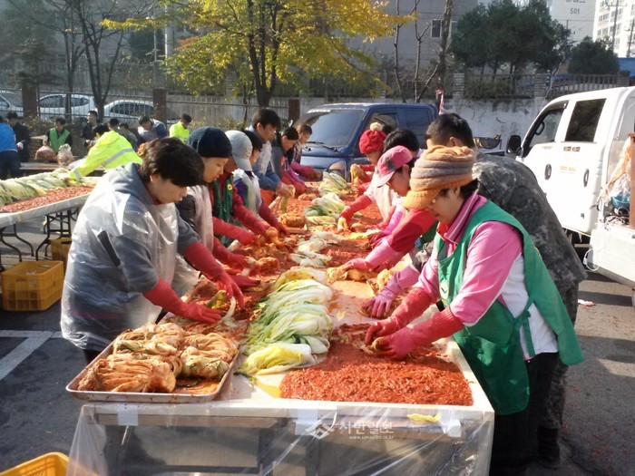 지난 5일 경기 동두천시 불현동 새마을남녀지도자협의회가 불현동 주민센터 주차장에서 그동안 고구마 재배 등을 통해 얻은 수익금을 활용해 지역내 기초수급자 등 어려운 가정에 전달할 김치를 만드는 '사랑의 김장 담그기' 행사를 열었다. 사진은 참여자들이 김치를 담그는 모습.(사진제공=동두천시청)