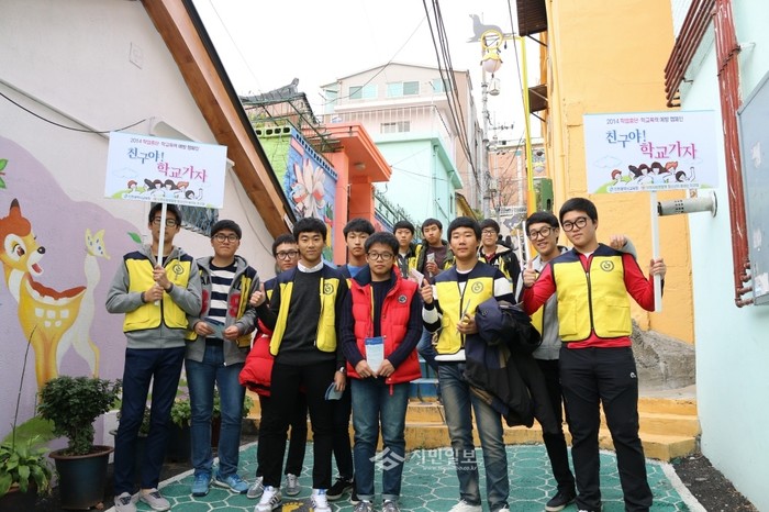지난 8일 인천 중부경찰서와 인천시교육청은 중구 차이나타운에서 인천여상, 중앙여상, 선인고 등 8개 학교·45명의 학생이 모여 학업을 중단한 친구들의 학교 복귀를 위한 캠페인을 실시했다. 사진은 이날 캠페인에 참여한 ‘청바지(청소년이 바라는 지구대)동아리’학생들의 모습. (사진제공=인천중부서)
