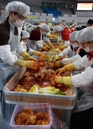 12일 서울 송파구 올림픽공원에서 열린 SK 행복김치담그기 행사에서 SK그룹 및 협력업체, 계열사 임직원 1000여명이 김치를 담그고 있다.