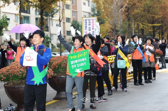 최근 서울 송파구가 ‘주민간 인사하기’ 운동을 확산시키기 위해 ‘인사하기 시범아파트’로 선정한 오금동 현대아파트에서 입주민들이 피켓을 들고 캠페인을 펼치고 있다.(사진제공=송파구청)