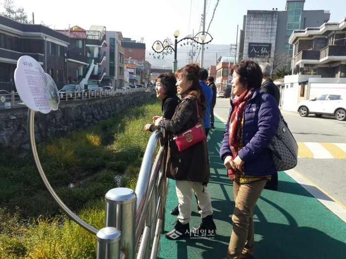 경기 이천시 관고동주민자치위원회에서는 최근 주민이 주도하는 마을만들기 '시와 문화가 있는 힐링로드' 조성사업을 완료했다. 사진은 힐링로드를 찾은 시민들이 시를 읽고 있는 모습. (사진제공=이천시청)