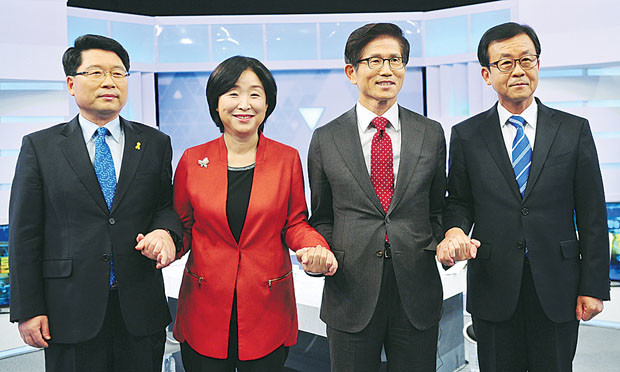 12일 오전 서울 여의도 KBS에서 중앙선거방송토론회 주최로 열린 2차 정당정책 토론회에 앞서 새정치민주연합 원혜영(오른쪽부터) 정치혁신실천위원장, 새누리당 김문수 보수혁신특별위원장, 정의당 심상정 정치똑바로특별위원장, 통합진보당 오병윤 원내대표가 손을 맞잡고 있다.