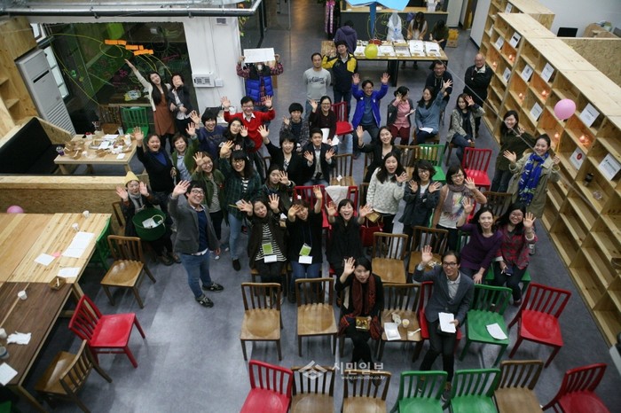 | ▲ 사회적경제허브센터를 이용하고 있는 은평구 주민들이 즐거운 얼굴로 손을 흔들고 있다. (사진제공=은평구청) | ||