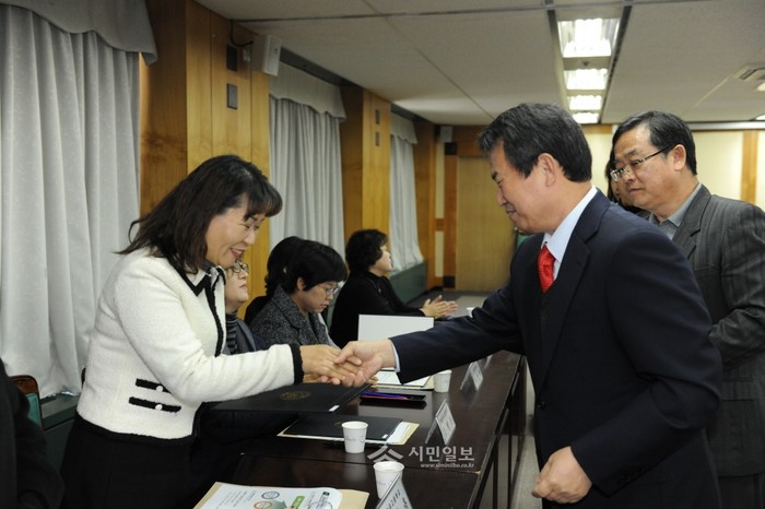 서울 중랑구는 13일 구청 4층 기획상황실에서 교육정책 추진과정에서의 참신한 의견을 수렴하기 위해 구성한 '제3기 행복중랑 학부모 모니터단' 위촉식을 진행했다. 사진은 나진구 구청장(오른쪽)이 학부모 모니터단에게 위촉장을 수여하고 있는 모습. (사진제공=중랑구청)