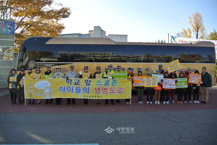 인천남부경찰서는 13일 남구 도화동 서화초등학교 어린이보호구역에서 안전한 스쿨존 정착을 위해 녹색어머니회, 지도교사, 학생, 교통경찰 등 30여명이 참여해 합동 캠페인을 실시했다. 사진은 이번 스쿨존 캠페인 후 관계자들이 기념촬영한 모습. (사진제공=인천남부경찰서)