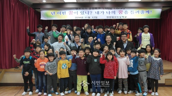 지난 12일 경기 연천 왕산초등학교는 교내 어울누리관에서 전교생을 대상으로 'Living Library, 2014 찾아가는 멘토와 함께하는 공감토크'를 실시했다. 사진은 공감토크 후 멘토와 기념촬영을 하는 학생들의 모습. (사진제공=연천교육지원청)