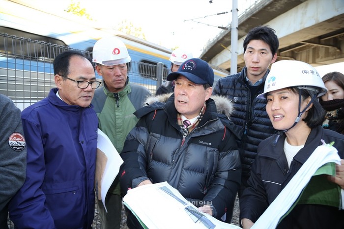 지난 13일 박홍섭 마포구청장(가운데)이 연남동에서 동교동으로 이어지는 경의선숲길 공원 공사현장을 찾아 관계자에게 진행상황을 보고받고 전기·통신 지중화 공사시 통행에 불편이 없도록 현장안내원을 배치하는 등 민원조치에 차질이 없도록 준비하며 안전하게 공사를 진행해 달라고 당부하고 있다. (사진제공=마포구청)