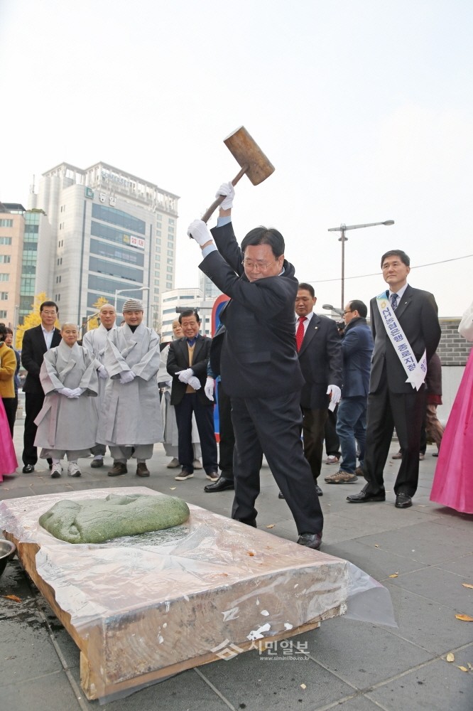 지난 11일 김복동 서울 종로구의회장이 인사동 북인사마당에서 우리 쌀 소비촉진운동의 일환으로 개최된 ‘우리 떡하니 사랑합시다’ 행사에 참석해 떡메를 들고 쑥떡치기 시연을 하고 있다. (사진제공=종로구의회)