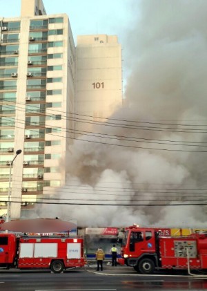 15일 오전 경기 용인 상하동의 한 상가에서 화재가 발생, 소방대원들이 화재진압을 벌이고 있다.