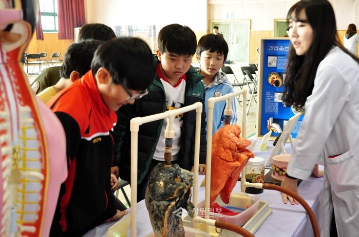 인천 강화군보건소는 최근 갑룡초등학교와 선원초등학교에서 학생 464명을 대상으로 직접 보고, 듣고, 만지고, 체험하는 '건강체험 이동학습관' 프로그램을 운영했다. 사진은 이날 프로그램에 참여한 학생들이 폐 모형을 보고 있는 모습. (사진제공=강화군청)