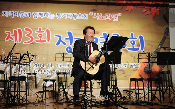 지난 15일 서울 양천구 지역의 기타동호회 '사노라면'이 서남병원 이화홀에서 몸이 불편해 문화활동에 참여하기 어려운 환자들과 인근 주민을 대상으로 '제3회 정기연주회'를 열었다. 사진은 연주에 나선 양천구의회 의장이자 동호회 회원인 심광식 의장의 모습.(사진제공=양천구의회)