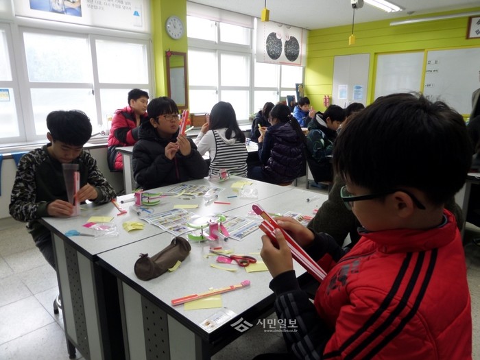 경북 구미시 구평초등학교는 지난 17일 2시간 동안 본교 과학실에서 5·6학년 학생 26명을 대상으로 구미발명교육센터의 ‘서동춘 선생님과 함께 찾아가는 발명교실’ 수업을 실시했다. 사진은 발명교실에 참여한 학생들이 ‘공기압 로봇팔’을 만들고 있는 모습. (사진제공=구미교육지원청)