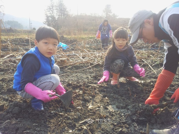 경기 포천시 군내면 명산리 연꽃 평화생태 마을에서 지난 16일 ‘가족과 함께 신나는 연근캐기 체험’을 실시했다. 사진은 이번 행사에 참가한 가족들이 연근을 직접 캐고 있는 모습. (사진제공=포천시청)