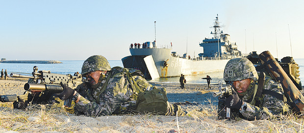 18일 오전 경북 포항 독석리 해안 일대에서 해군과 해병대 장병들이 2014 호국 합동상륙훈련을 하고 있다. 훈련 기간 중 해상위협 상황을 가정한 상륙전력 해상기동, 상륙해안의 위협 요소를 사전 제거하는 선견작전, 함정과 항공기를 이용해 상륙목표지역 내의 적을 무력화하는 대규모 화력지원 등 각종 상황을 부여하고 이에 대응하는 훈련을 실시한다.