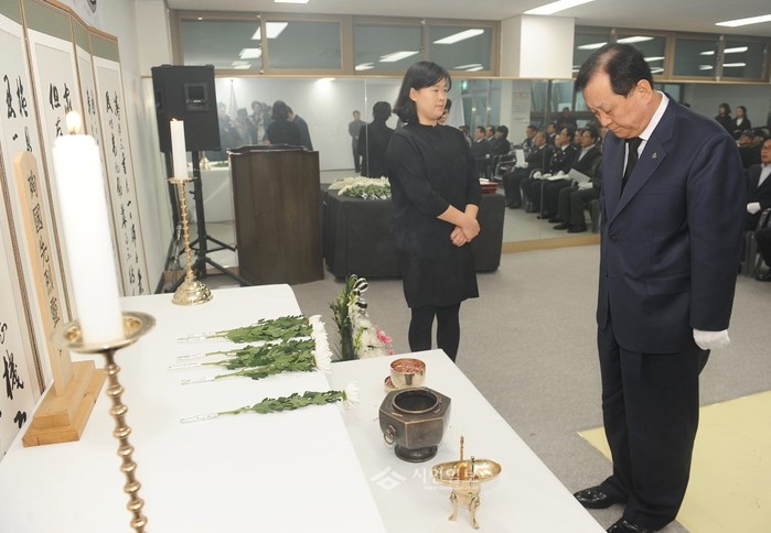 지난 17일 이교범 경기 하남시장이 하남문화원에서 열린 '제9회 경기·광주권 순국선열 추모제'에 참석했다. 이 추모제는 국가를 위해 헌신한 선열을 기념하기 위한 것으로 하남문화원, 광주문화권협의회가 주최하고 국가보운처 수원보훈지청, 하남시, 광주시, 성남시 등이 후원했다. 사진은 추모 중인 이 시장의 모습.(사진제공=하남시청)
