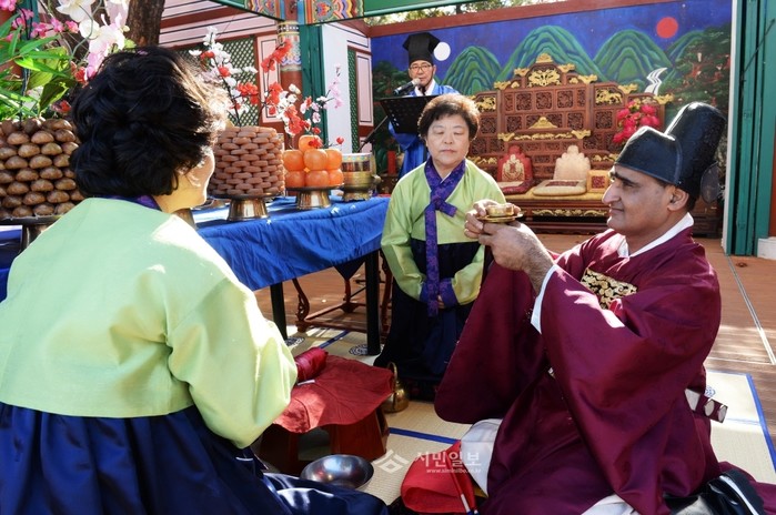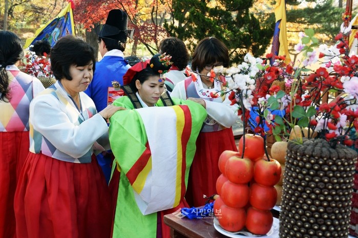 동대문구는 지난 18일 오전 11시 지역내 세종대왕기념관 궁중대례청 한옥무대에서 새마을지도자동대문구협의회 및 동대문구새마을부녀회 주관으로 '다문화가정 합동 결혼식'을 진행했다. 사진은 이날 진행된 '다문화가정 합동 결혼식'의 모습. (사진제공=동대문구청)