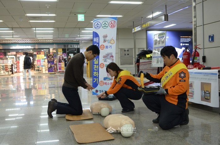서울 영등포소방서는 19일 오전 지하철 국회의사당역에서 출근하는 시민들을 대상으로 소방장비전시, 심폐소생술 체험장 운영, 소소심(소화기, 소화전, 심폐소생술) 홍보물 배부 등의 119이동홍보단 활동을 실시했다. 사진은 소방관과 함께 심폐소생술을 체험해보는 시민들의 모습. (사진제공=영등포소방서)