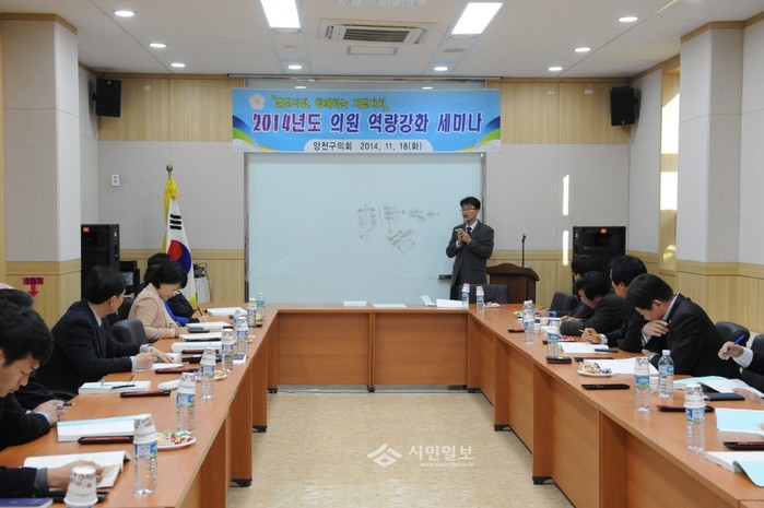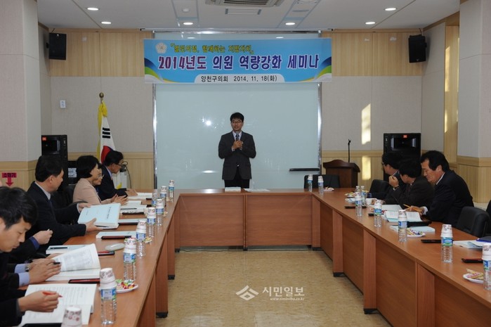 지난 18일 서울 양천구의회가 곧 열릴 정례회 기간에 실시될 행정사무감사와 오는 2015년도 예산안 심의에 대비해 의원들의 역량을 키우기 위한 교육을 실시했다. 이날 교육에는 김용석 서울특별시의회 기획경제위원장이 강사로 나서 행정사무감사 기법과 예산·결산에 관한 교육을 실시했다. 사진은 교육에 참여한 의원들의 모습. (사진제공=양천구의회)