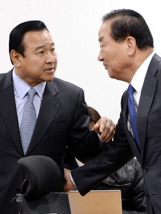 19일 오전 서울 여의도 국회 의원회관에서 친박 국가경쟁력강화포럼 주최로 ‘최경환 기획재정부 장관 겸 부총리 초청 강연회’가 열린 가운데 이완구 새누리당 원내대표(왼쪽)가 서청원 최고위원과 이야기를 나누고 있다.