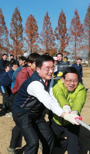 '제2회 가야문화권 지역발전 시장·군수 협의회 시·군 친선 체육대회'가 19일 경남 함안군 가야읍 공설운동장에서 열린 가운데 김종연 함양부군수를 비롯한 참석자들이 줄다리기를 하고 있다.