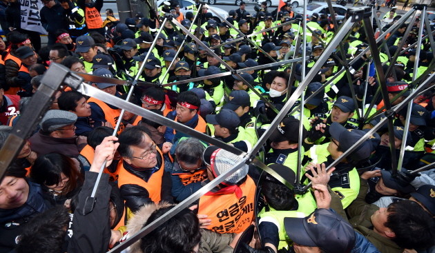 18일 오후 경기 수원 새누리당 경기도당사 앞에서 경기지역 공무원단체 등이 공적연금 파괴! 졸속적 연금개악! 새누리당 규탄 결의대회를 가진 뒤 농성천막을 설치하려 하자 경찰이 저지하며 몸싸움을 빚고 있다.