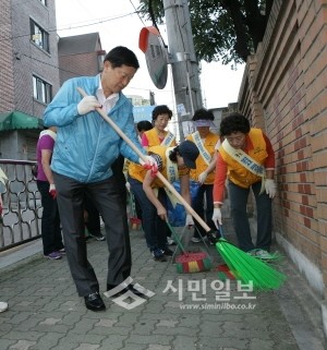 | ▲ 최창식 중구청장이 추석 명절을 맞아 실시한 골목 대 청소에 참가해 빗자루질을 하고 있다.(사진제공=중구청) | ||