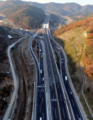 전남 화순군 대리~광주 동구 내남동을 잇는 국도 29호선 도로확장공사가 착공 7년 만에 마무리됐다. 이 구간은 21일 오후 4시 전면 개통됐다. 사진은 20일 오후 헬기에서 바라본 국도 29호선 5.7㎞ 구간의 모습.