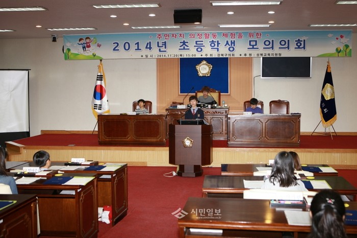 20일 서울 강북구의회 본회의장에서는 지역내 초등학생을 대상으로 지방의회의 역할과 기능을 체험하는 '2014년 초등학생 모의의회'를 개최했다. 사진은 모의의회에 참가한 학생들이 의사진행을 하고 있는 모습. (사진제공=강북구의회)